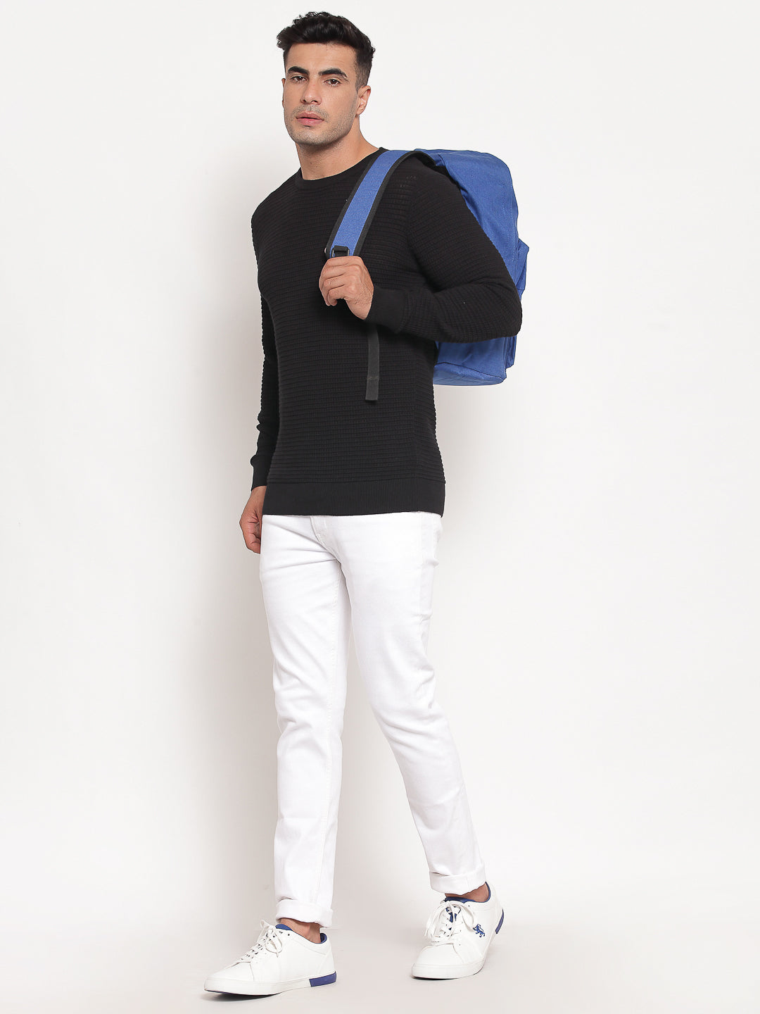 Add a touch of definition to an otherwise self design pattern look, full sleeves with this Black colored sweater from the house of Red Tape. A wear-anywhere piece of regular fit with full sleeves, created using 100% COTTON, 12 GG, base material with knit fabric, just to add a dash of attraction to your overall look. This casual sweater meant to last a lifetime, this piece will make you look smart no matter what you wear it with. Easily wash it in machine with similar colors. Pair it with well-fitted trousers and a pair of oxford shoes for a classy look on any casual occasion.