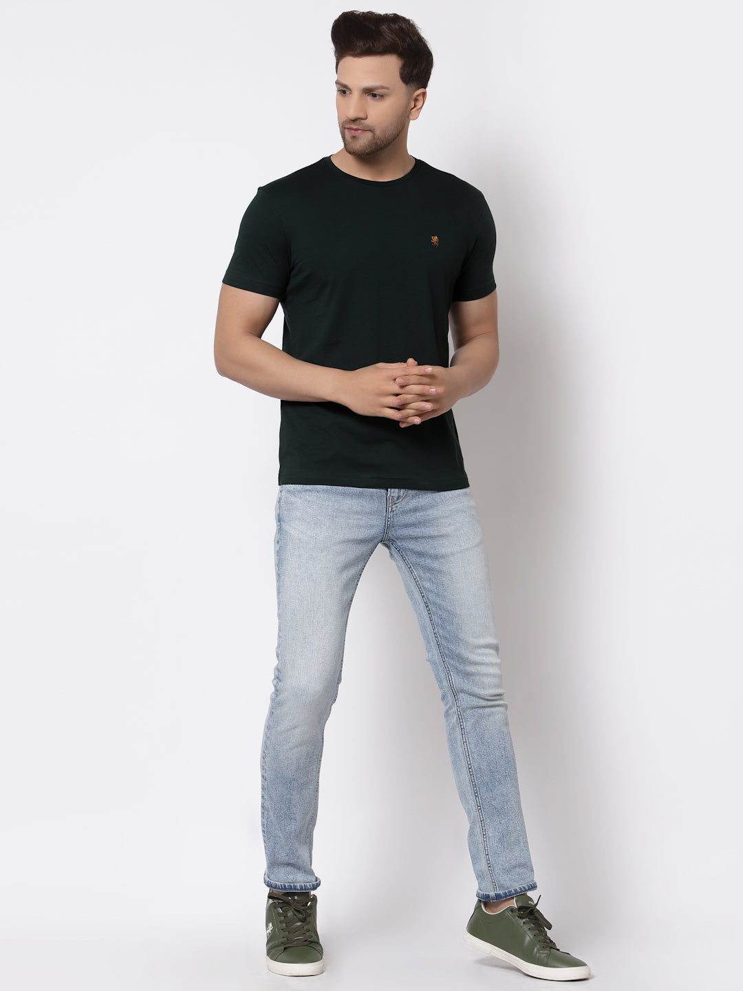 Perfect for your on-the-go life; this T-shirt makes outfitting easier then ever. Tailored in premium cotton for a soft feel and superb comfort, it's regular fit design assigns it a touch of classic fashion, while the advanced tech makes it a very pleaureable wear. It Features a embroidered logo, half sleeves and round neck for a chic look. Pair it with denims for maximum style.