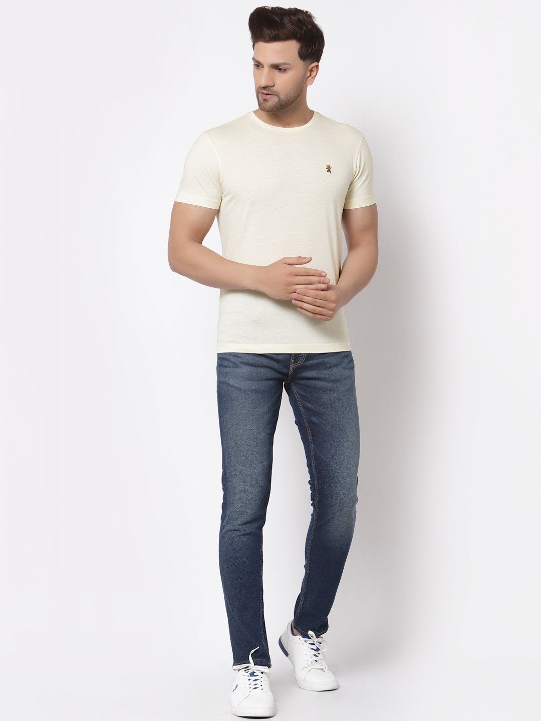 Ace weekend dressing in this Ivory solid round neck t shirt from Red Tape. It features a round neck and half sleeves design which ensures a regular fit. Solid pattern with embroidered logo gives a cool look to your style. Style it up with a pair of Blue denim and Black shoes to complete the look. Machine wash this with similar color.