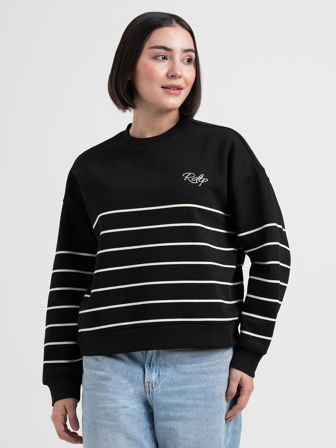 Stay stylish and comfortable with this Red Tape striped sweatshirt women's, crafted in a classic black shade for versatile, everyday dressing. Designed with a clean striped sweatshirt aesthetic, it offers a perfect balance of warmth and breathability with its soft 60% cotton and 40% polyester fleece knit. The round neck, full sleeves, and pocket-free design create a sleek, effortless silhouette ideal for casual outings and relaxed days.